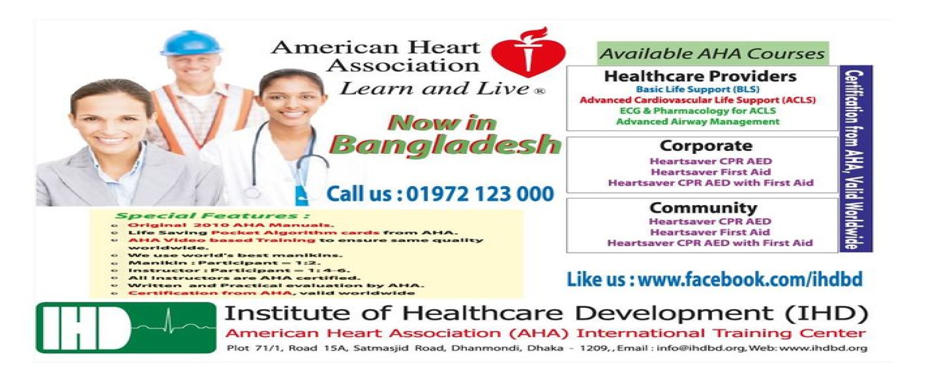 Institute of Healthcare Development (IHD) is the first affiliated International Training Center (ITC) of the prestigious American Heart Association (AHA), in Bangladesh, and have been providing the following AHA courses for Physicians, Nurses and other Healthcare Providers since April 2011: